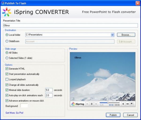 iSpring Converter Free – удобный инструмент для преобразования презентаций выполненных в формате PowerPoint в распространенный формат Flash. Поддерживаются видео и анимационная графика.