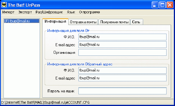 The Bat! UnPass – это крайне удобная утилита способная просматривать скрытую информацию о настройках почтовых ящиков в программе The Bat!, включая просмотр паролей.