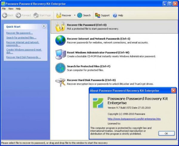 Passware Kit Enterprise – набор утилит, предназначенный для простого и быстрого поиска, восстановления, подбора и сброса паролей к более чем 180 типам файлов. Программа очень проста в использовании и будет незаменима в системном администрировании.