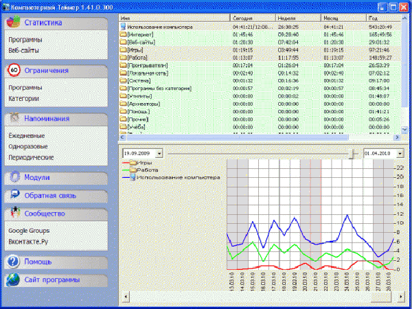 Компьютерный Таймер – это программа для ведения учета всех действий произведенных за компьютером, проведенного в времени в общем и за конкретными программами. Если один из расчетных параметров превышает заданный порог, то программа посоветует сделать вам небольшую паузу и немного размяться.