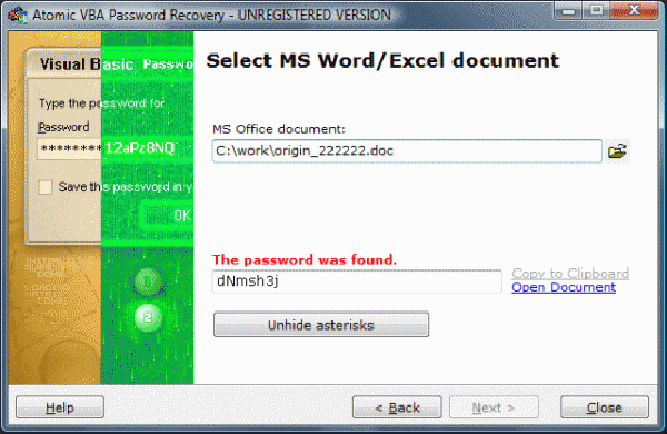 Atomic VBA Password Recovery – программа для восстановления VBA-пароля гот документов офисного пакета Microsoft Office 95-2003, включая документы файлов Microsoft Excel (.xls), Microsoft Word (.doc) и Microsoft Access (.mdb).