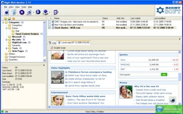 Right Web Monitor - удобный инструмент для обнаружения изменений в интернет-ресурсах (работает с любыми типами файлов, может анализировать только определенный фрагмент вэб-страницы, проверять почтовые ящики). Программа с заданной периодичностью проверяет указанные ресурсы и уведомляет Вас, в случае, если обнаружены изменения. Уведомление возможно с помощью всплывающего окна, проигрывания мелодии и посылкой письма по электронной почте. Также возможна загрузка измеенного файла на жесткий диск Вашего компьютера. Используя Right Web Monitor, Вы всегда будете в курсе последних новостей, никогда не пропустите обновления интересующего Вас программного обеспечения, последние версии драйверов всегда будут готовы к установке на вашем компьютере сразу же после выхода. И все это без постоянных ручных проверок - Вам больше не нужно тратить время на это утомительное занятие. Программа также может проверять вэб-ресурсы, которые не доступны по прямой ссылке (т.е. нужно заполнять формы, проходить несколько промежуточных страниц) - Вам достаточно один раз выполнить необходимые действия во встроенном браузере и в дальнейшем, при проверке данного ресурса, программа будет эмулировать все Ваши действия. Может работать через SOCKS и HTTP прокси. Есть возможность внедрения в Internet Explorer для добавления необходимых ресурсов одним кликом.