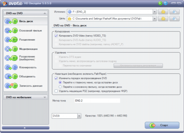 DVDFab HD Decrypter – программа для копирования DVD-дисков на жесткий диск. Программам очень проста в использовании и не вызовет никаких сложностей даже у начинающих пользователей.