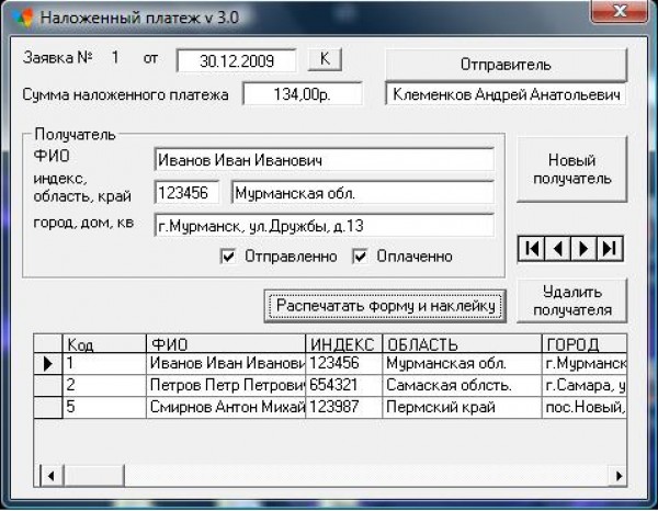 Программа связана с базой данных, где регистрируются все раннее введеные отправления, тем самым экономя время на ведение учета получателей и заполнения бланков.