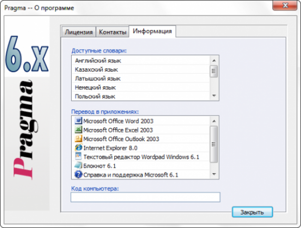Pragma – это программа для машинного перевода текстовых документов с поддержкой семи переводных словарей: английский, русский, украинский, немецкий, латышский, польский, французский и казахский.