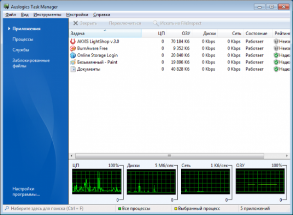 Auslogics Task Manager – программа для отображения доскональной информации о том, сколько ресурсов потребляет той или иной процесс. Программа покажет сколько памяти, процессора, диска и интернет трафика используется различными задачами.