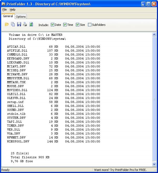PrintFolder – удобная программа для печати списка файлов выбранной директории. Вам просто нужно щелкануть правой кнопкой мыши на интересующей вас папке и выбрать из контекстного меню, появившийся пункт 'PrintFolder'.