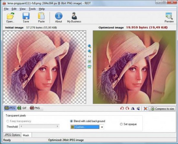 RIOT Portable представляет собой графический редактор – портативную (возможность запуска со съемного носителя) версию неплохого графического редактора RIOT. Основной целью RIOT Portable служит уменьшение веса изображения без значительного изменения качества.