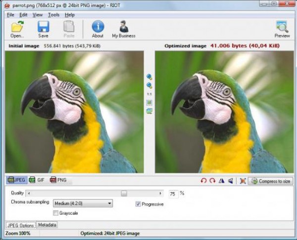 RIOT представляет собой графический редактор, основной целью которого служит уменьшение веса изображения без значительного изменения качества. RIOT так же может быть скачена в качестве плагина к GIMP и IrfanView.