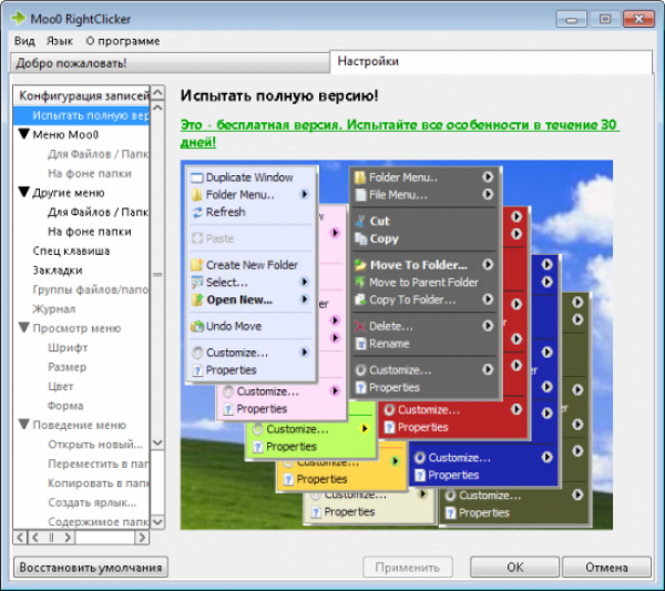 Moo0 RightClicker – это небольшая программа, способная заменить собой контекстное меня проводника Windows, которое вызывается по клику правой кнопки мыши. Moo0 RightClicker служит для облегчения работы и ускорения выполнения простых операций.