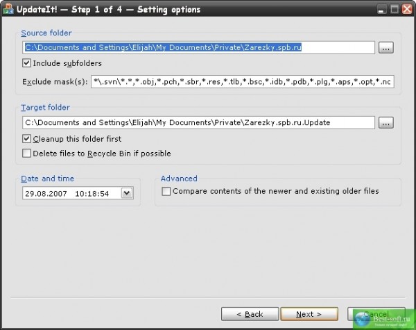 "Волшебник" (wizard), написанный мной для быстрого и удобного обновления своего сайта. Ищет в исходной папке (при желании - рекурсивно) все файлы, модифицированные позже заданных даты/времени. Может скопировать найденные файлы (все или выборочно) в целевую папку с сохранением исходной структуры вложенных папок. Позволяет закачать все файлы из получившейся папки (с сохранением ее структуры) на заданный FTP-сервер; сжать получившуюся папку в одноименный zip-архив; отослать этот архив на заданный адрес электронной почты.Распространяется с исходными текстами (C++/MFC).