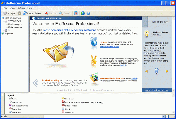 Программа FileRescue Professional - простая в использовании и одновременно мощная программа для восстановления удаленных и потерянных файлов и папок. Она позволяет вернуть файлы удаленные в результате неосторожного форматирования, вирусных атак, ошибок в работе программного обеспечения, файлы удаленные из Корзины, а также в случае удаления помимо Корзины (к примеру через Shift-Delete).
