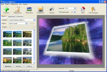 Эффекты можно комбинировать для создания действительно фантастических композиций. Выбранные фильтры применяются как ко всему изображению, так и к отдельным его частям, выделяя наиболее важный фрагмент фотографии. Мастер Эффектов поможет украсить домашний фотоальбом, веб-сайт и даже позволит создать оригинальную открытку.