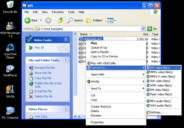 Конвертер видео файлов AVI, MPEG, RM, MOV, ASF, WMV, SWF, FLV, MPEG 4 (IPOD/PSP/Mobile), M4V, 3GP, 3G2. Встраивается в выпадающее меню, возникающее при щелчке правой клавишой мыши на видео файле. В состав включен видеопроигрыватель.