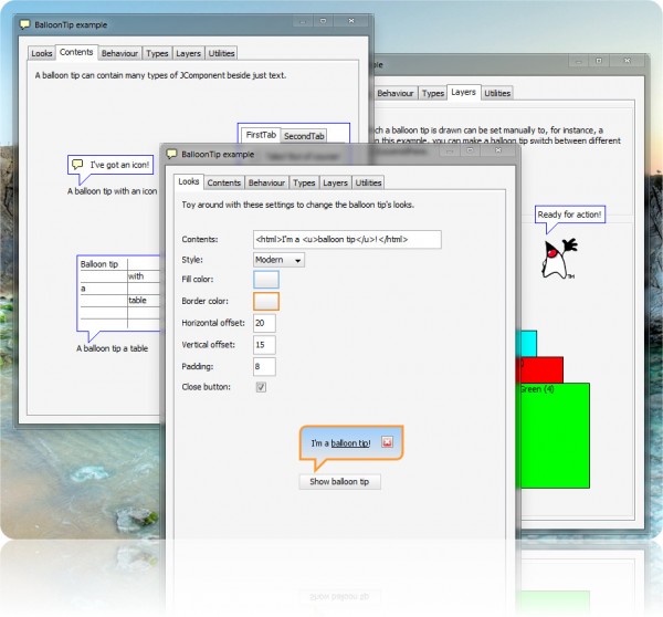 BalloonTip – это небольшая утилита, представляющая собой всплывающие подсказки для Java. BalloonTip позволяет "оживить" Java приложения добавив в него всплывающие подсказки.