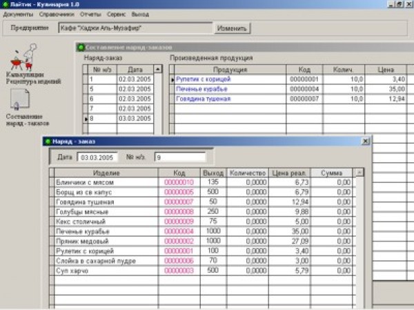 Программа учета производства для кулинарий, кондитерских цехов, баров, кафе. Ведение калькуляционных карточек (рецептов). Составление нарядов-заказов на производство. Автоматический расчет расхода сырья.