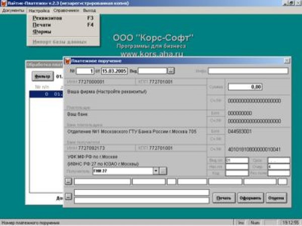 Программа для формирования платежных поручений. Возможность автоматического формирования назначений платежей, в т.ч. в соответствии с последними, вступающими в силу с 1 января 2005 г. изменениями о 20-значных КБК.