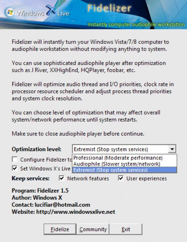 Fidelizer это небольшое приложение, которое превратит ваш компьютер в рабочую станцию для аудиофилов. Fidelizer не вносит постоянных изменений в систему, поэтому после перезагрузки, ваша ОС будет выглядеть так же, как и раньше.
