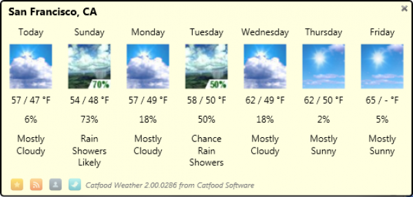Catfood Weather – это небольшая утилита, предназначенная для отображения на рабочем столе прогноза погоды на неделю вперед.