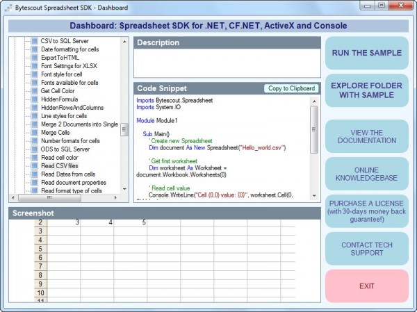 Bytescout Spreadsheet SDK - является. NET библиотекой, предназначеной для чтения, записи и изменять Excel (XLS ) с. NET языков программирования C #, Visual Basic.NET, ASP.NET.