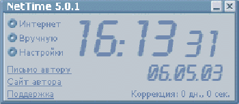 Программа для синхронизации времени через Интернет, с рядом полезных функций: очистка Корзины, очистка папки временных файлов Windows, очистка папки временных файлов IE, очистка Cookies. Поддержка работы через прокси. Имеется возможность выбора и добавления серверов точного времени. Возможность автоматической выгрузки программы из памяти после успешной синхронизации. Ведется статистика всех попыток синхронизации в удобочитаемой форме.