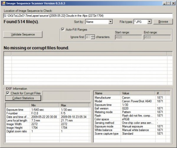 Image Sequence Scanner – это простое в использовании приложение, специально созданное, чтобы помочь вам найти недостающие изображения в последовательности и генерировать статистику на основе данных EXIF.