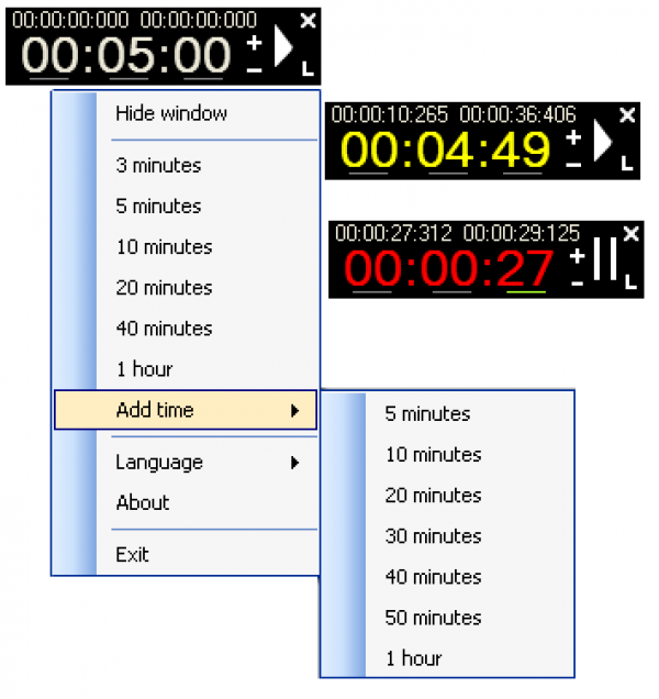 Для установки времени на таймере можно использовать предустановленные значения времени либо установить любое время кнопками '+' и '-'. Ко времени выполнения текущей задачи можно добавлять время и когда таймер работает.