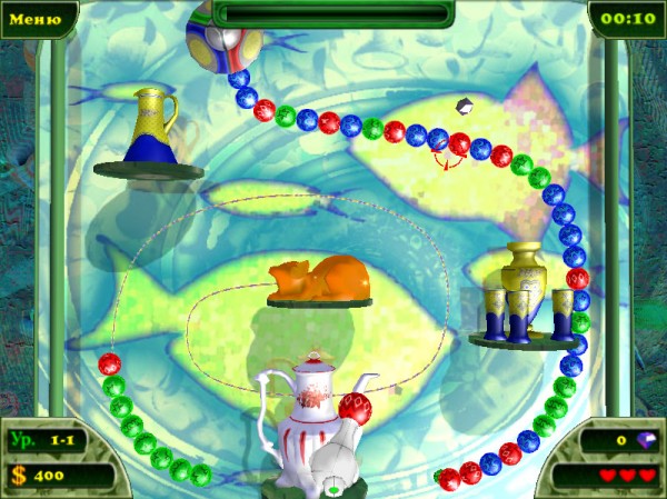 В этой трехмерной компьютерной аркаде вам предстоит очистить множество уровней от цепочек движущихся шариков. Чтобы справиться с этой задачей запускайте из пушки разноцветные шары с таким расчетом, чтобы совместить на цепочке минимум три фишки одного цвета. Однако будьте предельно внимательны: если шарики достигнут фигурки бронзовой кошки, то вы потеряете одну жизнь.