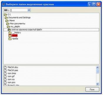 Программа "Скрытая папка" предназначена для снятия атрибута "суперскрытый, системный" с папок. Такая необходимость возникает после атак некоторых видов вирусов, которые скрывают папку путём установки атрибута "суперскрытый, системный" и после лечения системы от вирусов, стандартными средствами системы снять эти атрибуты невозможно. Работать с программой очень просто: выбираем нужные папки выделенные красным цветом (нужно быть осторожным, программа не делает различий системная эта папка или нет) и нажимаем кнопку "Пуск".
