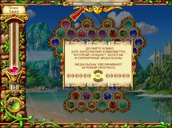 Суть игры проста, а процесс увлекателен. Вам предстоит менять местами магические артефакты, составляя по три в ряд. Собирать сокровища Амазонии вам помогут разнообразные бонусы. Приятная музыка, сочная графика, затягивающий процесс, яркие эффекты надолго удержат вас в игре.