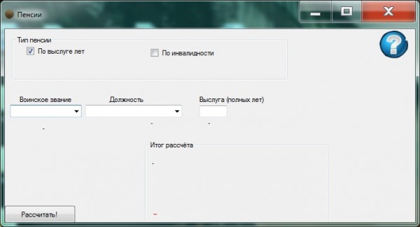 С 1 января 2012 года будут повышены не только оклады военнослужащих, но и пенсии военных пенсионеров. Данная программа поможет вам рассчитать размер своей пенсии исходя из оклада по званию, должностного оклада и надбавки за выслугу лет. Можно посчитать не только размер пенсии по выслуге лет, но и пенсию по инвалидности.