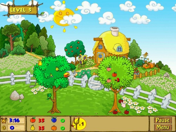 Вы всегда мечтали о маленьком фруктовом садике? Теперь он у вас есть - там растут яблоки, груши, сливы и персики, а рядом лес и озеро. В общем, все что надо для счастья - только сиди и собирай спелый урожай, денежки зарабатывай. Но не все так безоблачно - то откуда ни возьмись, налетают вороны - расхитительницы фруктов, то переспелые плоды падают на землю и портятся... А червячки из них так и норовят забраться на какое-нибудь фруктовое дерево и попортить еще парочку плодов. Так что борьба за урожай обещает быть интересной! Игра содержит два режима, приятно оформлена графически и музыкально, и всячески заслуживает того, чтобы красоваться фруктовым ярлыком на вашем рабочем столе.