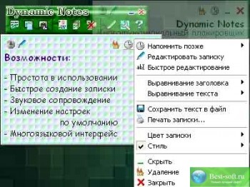 Программа Power Notes Lite - это удобный органайзер, редактор заметок и напоминалка для Windows, позволяющая создавать электронные записки (стикеры) и показывать их в нужный момент времени. Программа очень проста в использовании и нетребовательна к ресурсам. Планировщик находится в трее, не мешая работе, при необходимости его можно отобразить в виде небольшой панели на рабочем столе. Настройке поддаются все нужные параметры: записка может быть любого размера, любой цветовой гаммы (что позволяет, например, отличать заметки по одной теме от другой), имеется возможность использования различных стилей записок (скинов). Также поддерживаются звуковые схемы показа заметок. Кроме мастера создания стикеров, предусмотрена возможность как быстрого, так и расширенного редактирования. Кроме того, программой поддерживается многоязыковой интерфейс. Пользуйтесь Power Notes Lite и вы никогда ничего не забудете!!!