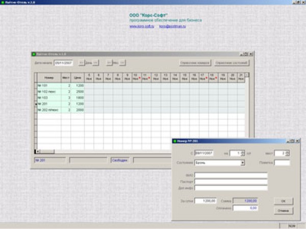 Программа для учета в небольших отелях, гостиницах, базах отдыха. Подходит для сдачи квартир, апартаментов, коттеджей и т.п. Удобный и наглядный режим бронирования, заселения номеров.