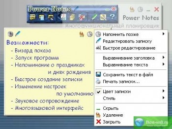 Power Notes - простой органайзер, планировщик и напоминалка для дома и офиса, позволяющая создавать электронные заметки и показывать их в нужный момент времени. Органайзер очень прост в использовании и нетребователен к ресурсам. Органайзер Power Notes позволяет создавать электронные заметки (стикеры) редактировать заметки в быстром и в расширенном режиме устанавливать дату и время напоминания настраивать параметры заметок по умолчанию (размер, цвет текста, фона и заголовка заметки, положение на рабочем столе, прозрачность заметки; "горячие" клавиши) Также органайзер позволяет: детально настраивать дату и время напоминания с помощью "Визард показа" запускать программы и открывать web-страницы с появлением заметки распечатывать текст заметок сохранять текст заметок в файл использовать различные скины заметок