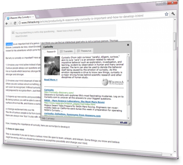 InfoAtoms – это расширения для браузеров Opera, Mozilla и Internet Explorer для поиска подробной информации о выбранном слове или фразе, причем вся информация будет показана в удобном всплывающем окне.