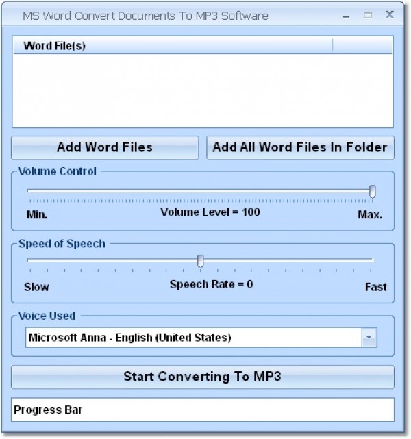 MS Word Convert Documents To MP3 Software – удобная программа, которая преобразует текст ваших MS Word документов в голосовые файлы в формате MP3.