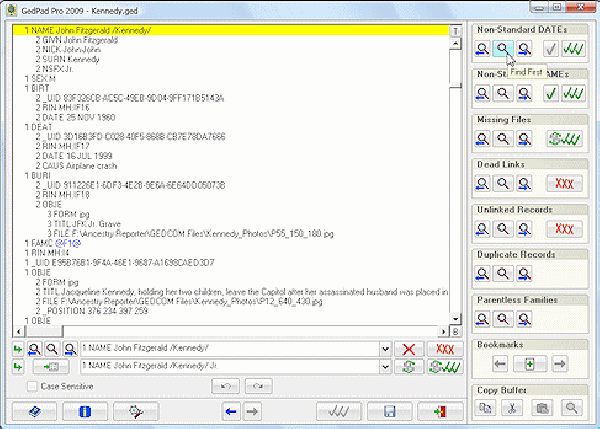 GedPad Pro это простой инструмент для просмотра файлов .GED. GedPad Pro позволяет находить нестандартные формы имени и даты, отсутствующие файлы и ссылки и дублирование записи внутри любого файла GEDCOM.