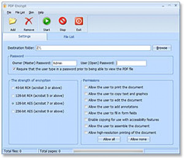 PDF Encrypt – удобная программа, позволяющая шифровать файлы PDF. Вы сможете установить пароль на доступ и на редактирование документов, так же есть возможность запретить печать, копирование и некоторые другие действия.