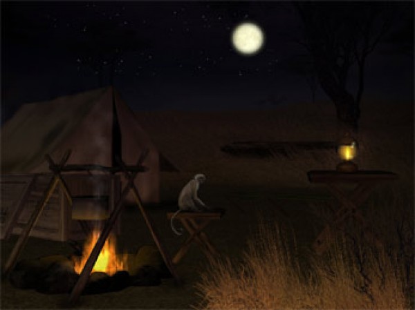 Исследователи природы соорудили где-то на просторах африканской саванны небольшой лагерь. И вот в очередной раз они вернулись сюда, чтобы переночевать. Развели костер, чтобы приготовить ужин. И тут же из темноты появилась их подружка - любопытная обезьянка, которая каждый вечер приходит к ним в гости.