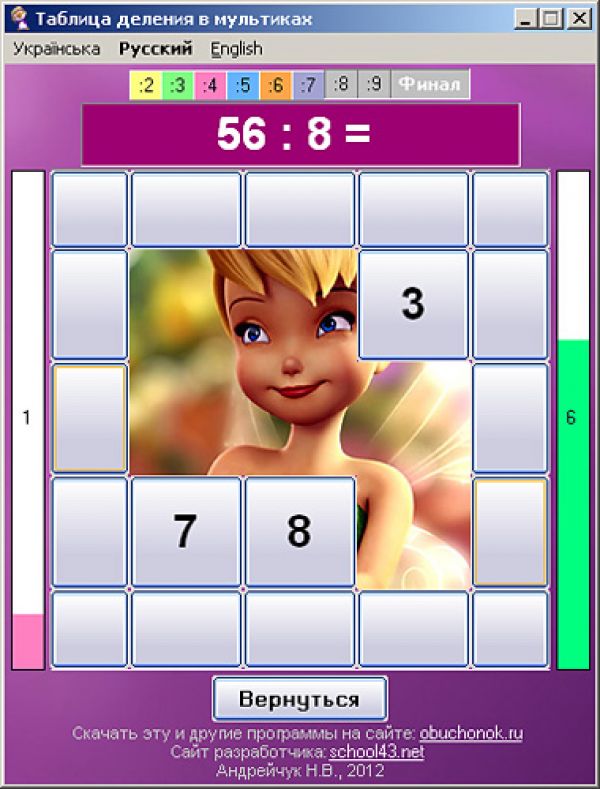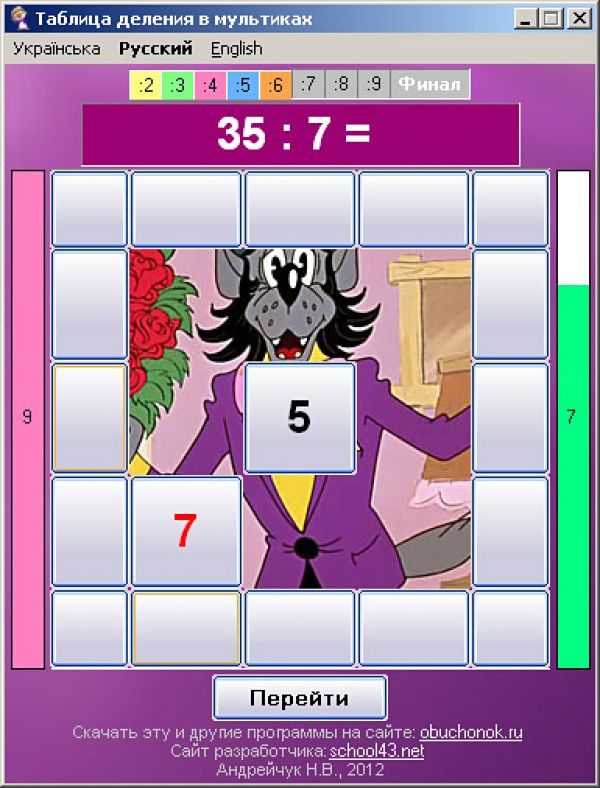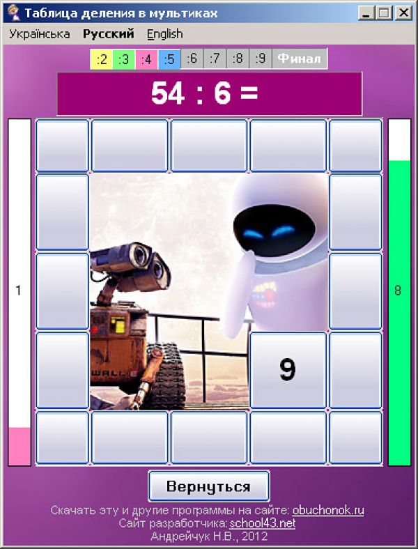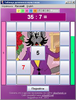 Обучающая программа по математике, позволяющая изучать таблицу деления двузначных чисел на числа от 2 до 9 поэтапно с использованием картинок и мелодий из отечественных и зарубежных мультфильмов.