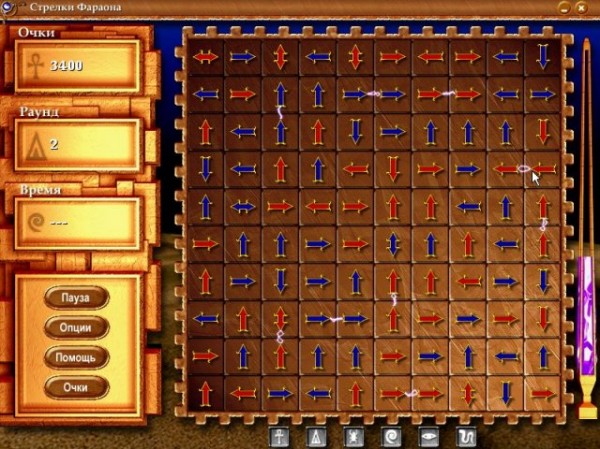 В логической аркаде "Стрелки фараона" и у вас появляется возможность почувствовать себя настоящим египтологом и сойтись в интеллектуальном поединке с древним царем. На игровом поле беспорядочно расположены разноцветные стрелки. Ваша задача - повернуть три (и более) стрелки одного цвета в одном направлении. Каждая удачная комбинация высвобождает заключенную в этих стрелках энергию и пополняет ею магический сосуд. Как только он будет заполнен, вы перейдете на следующий этап.