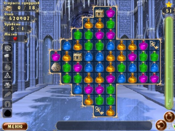 На игровом поле в хаотичном порядке расположены цветные бутылочки. Среди них находятся заветные сундучки и ключики. Ваша задача поместить их на соседние клетки, а затем совместить. Для этого нужно передвигать бутылочки таким образом, чтобы после каждого хода получилась непрерывная линия из трех или более фишек одного цвета.