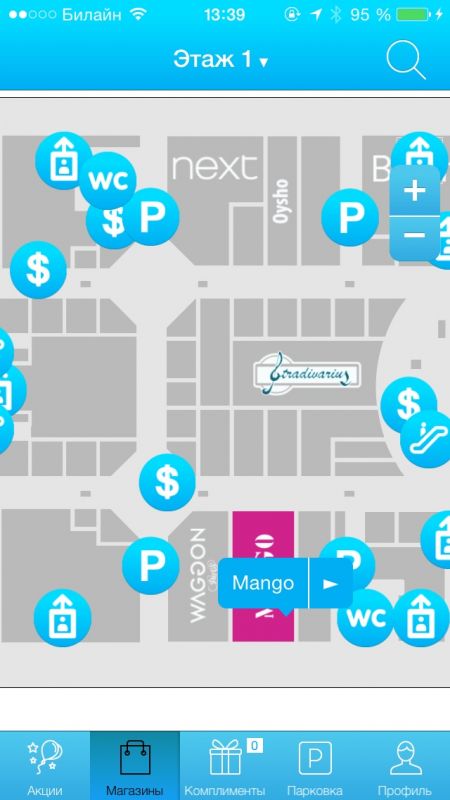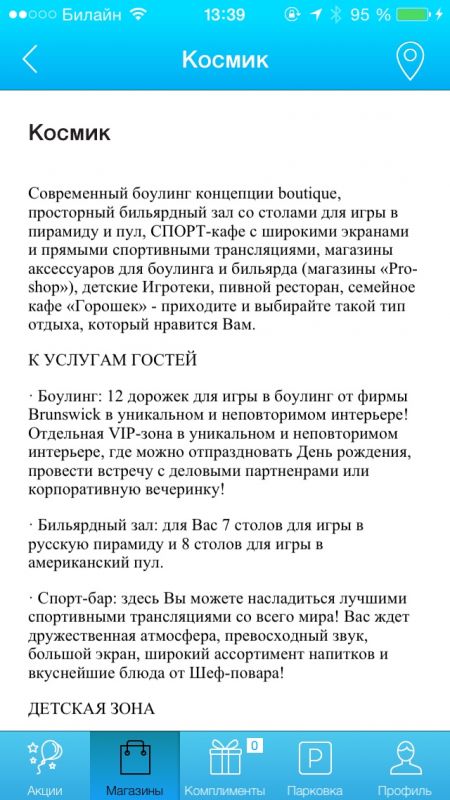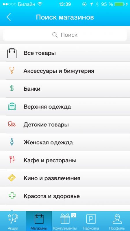 Раздел магазинов содержит перечень всех магазинов в торговом центре с возможность поиска по названию.