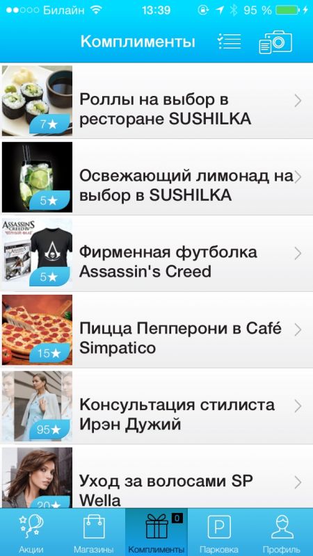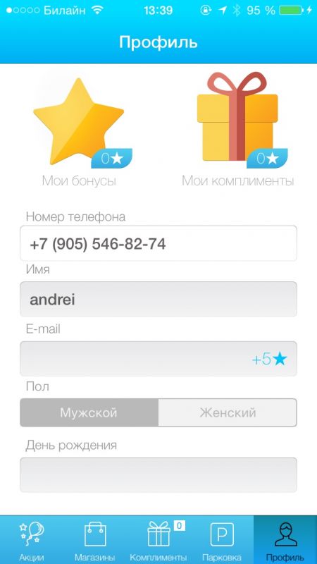 При покупке чего-либо в АФИМОЛе можно сфотографировать чек в мобильном приложении, и получить за это бонусные баллы, которые называются комплименты. Комплименты потом можно потратить в ТЦ. Для накаливания комплиментов необходима обязательная регистрация путем ввода телефонного номера.