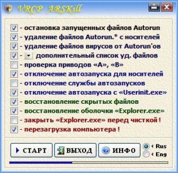 Используя утилиту ARSKill, вы сможете предотвратить запуск авторанов и других вредоносных программ вместе с запуском системы, съемного носителя и других устройств. Утилита также помогает провести сканирование и обнаружить уже работающие версии в памяти системы.