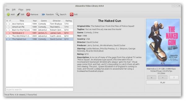 Alexandra Video Library - замечательное приложение, благодаря которому можно организовать собственную видеотеку. Добавляйте понравившиеся видео в каталог и запускайте их в любой момент. Более того, вы можете воспользоваться дополнительными полями и заполнить всю информацию о фильме по своему усмотрению. Если для вас фильмы, это не просто развлечение, а вполне серьёзное хобби, тогда данная утилита будет интересна.