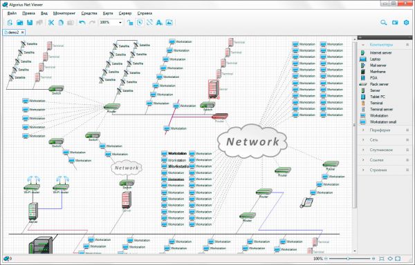 - Красивая графическая визуализация сети. Легкая навигация по топологии сети.