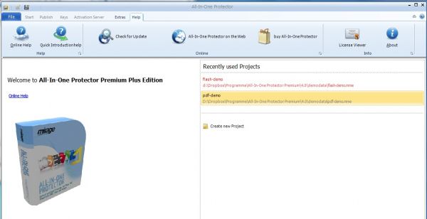 All files of a project (project with Images, Video, Audio and other files) are encrypted into one single database. At no time there is an access to the original file format like flash, PDF or EXE. All-In-One Protector comes with an own Player/Viewer which requires no installation on the end user PC. All type of media like CD/DVD, Download or USB stick is supported.