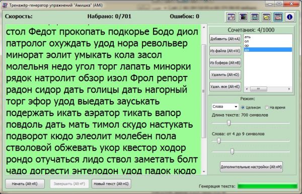 В главном окне набора отображается подсказка для новых пользователей. Для быстрого старта нажмите кнопку "Новый текст". Будет сгенерирован новый текст на основе сочетаний, заданных в окне справа (по умолчанию задано единственное сочетание "ок"). После окончания генерации нажмите кнопку "Начать".